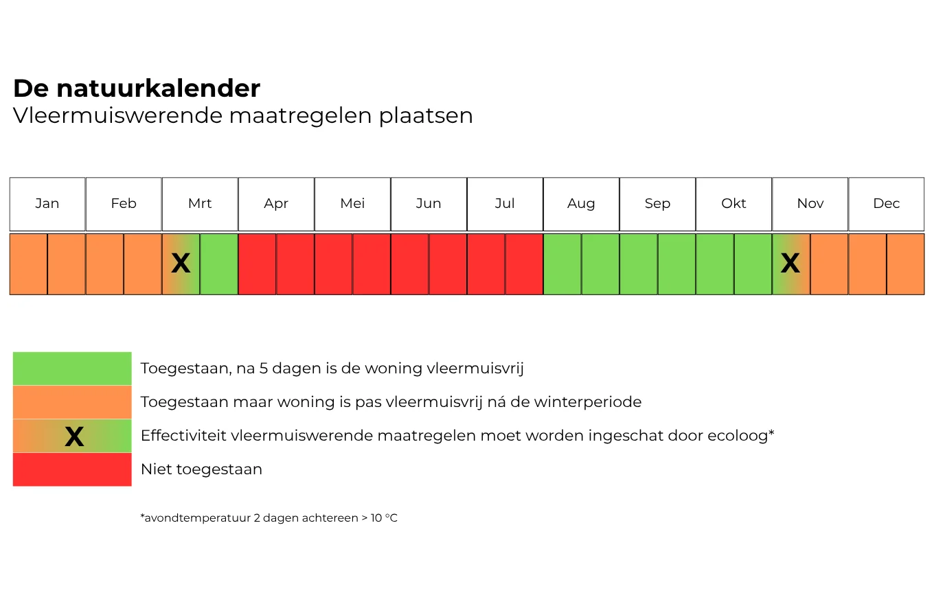 De natuurkalender geeft aan wat de fases zijn van de verschillende dieren van uw woning. Voor het natuurvriendelijk isoleren van uw huis is bijv. de natuurkalender voor de vleermuis erg belangrijk. Hieruit kunt u afleiden welke werkzaamheden in een bepaalde periode wel of niet kunnen worden uitgevoerd. Op de natuurkalender van de vleermuis zijn er 2 belangrijke perioden: De winterperiode (een soort winterslaap) en de kraamperiode. Met deze perioden moet rekening gehouden worden als u bijv. uw spouwmuren of dak wilt laten isoleren door Hepro.